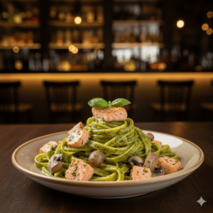 Tagliatelles, saumon, pesto, champignons, saumon