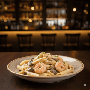 Penne, champignons, crevettes, crème