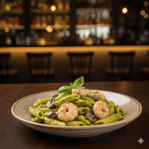 Penne, champignons, crevettes, pesto