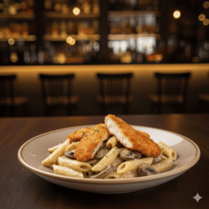 Penne, escalope, crème, champignons