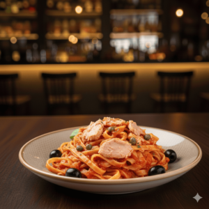 Tagliatelles, thon, câpres, olives, sauce tomate
