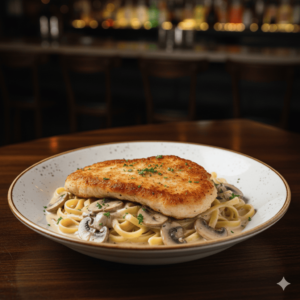 Escalope de poulet, crème, champignons, tagliatelle