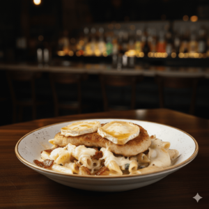 Escalope de poulet, chèvre, miel, penne à la crème