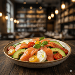Tomates cerises, saumon, avocat, mozzarella, huile d’olive