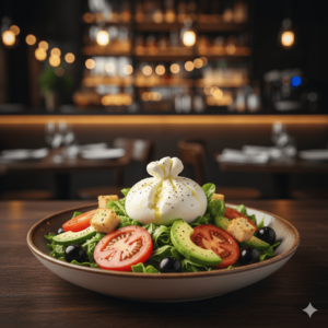 Salade, tomates, croûtons à l’ail, mozzarella burrata, avocat, olives