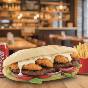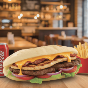 Salade, tomate, oignons, steak, steak de poulet, bacon, sauce cheddar