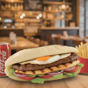 1 Viande au choix (poulet curry, poulet nature, chicken chika, cordon bleu, tenders, jambon, nuggets, steak fait maison, kebab+ lardons)