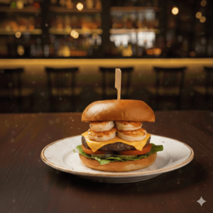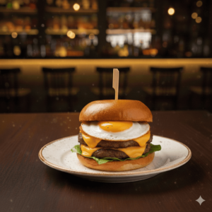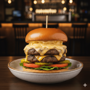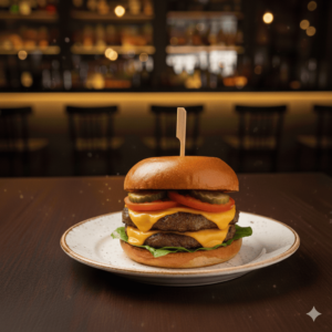 Cornichons, tomates, salade, 2 steaks, cheddar, bacon, oignons frits