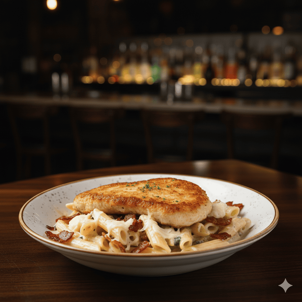Escalope de poulet, lardons de dinde, mozzarella, penne à la crème
