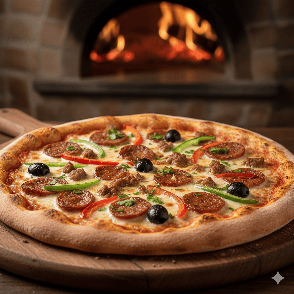 Base tomate, viande hachée, champignons, poivrons, mozzarella