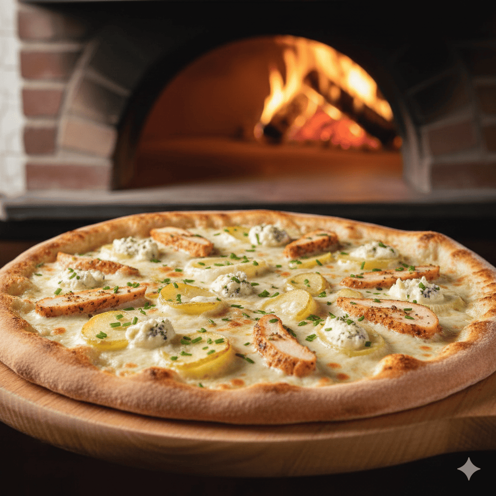 Base tomate, poulet, pepperoni, pommes de terre, mozzarella