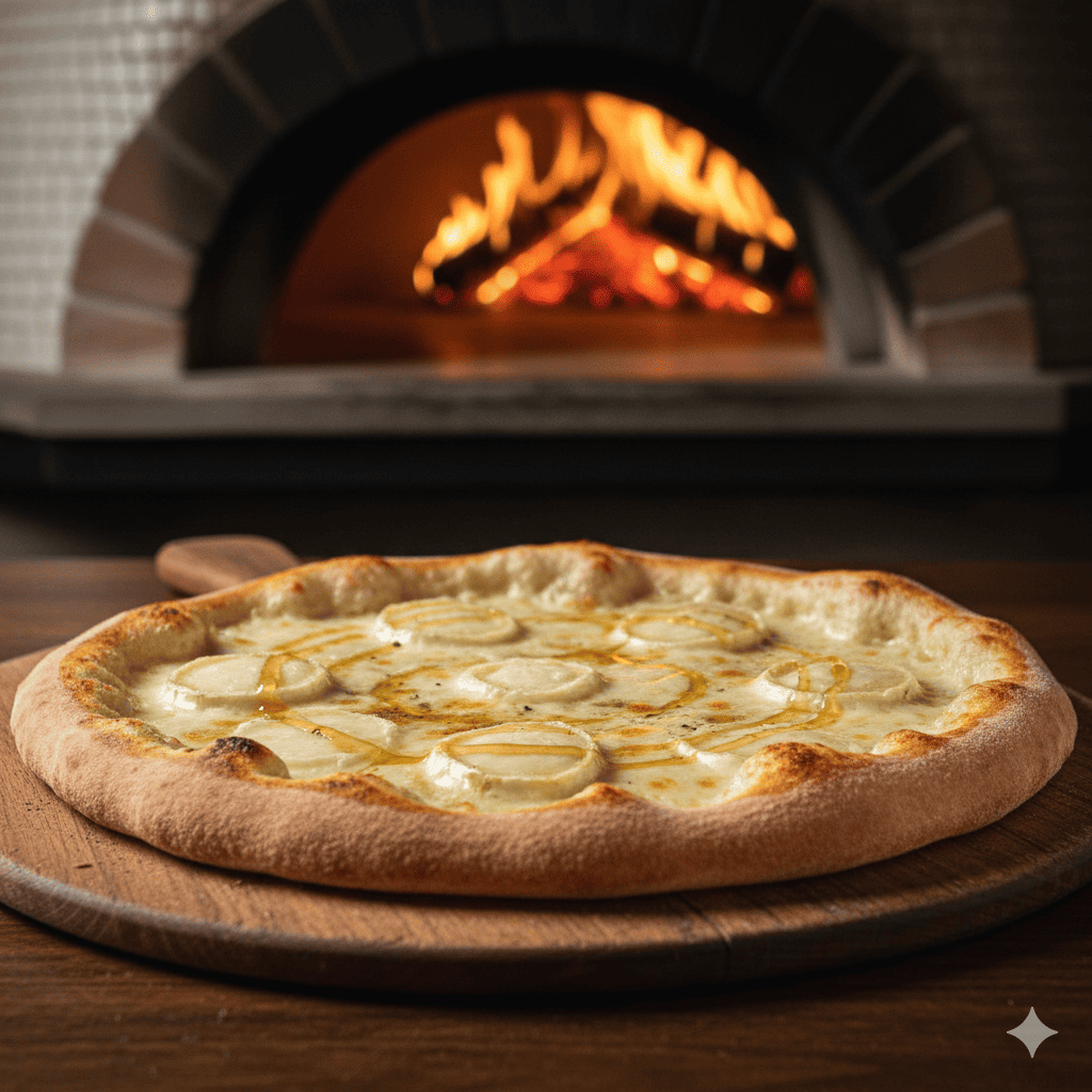 Base crème fraîche, mozzarella, viande hachée, chèvre, olives, burrata