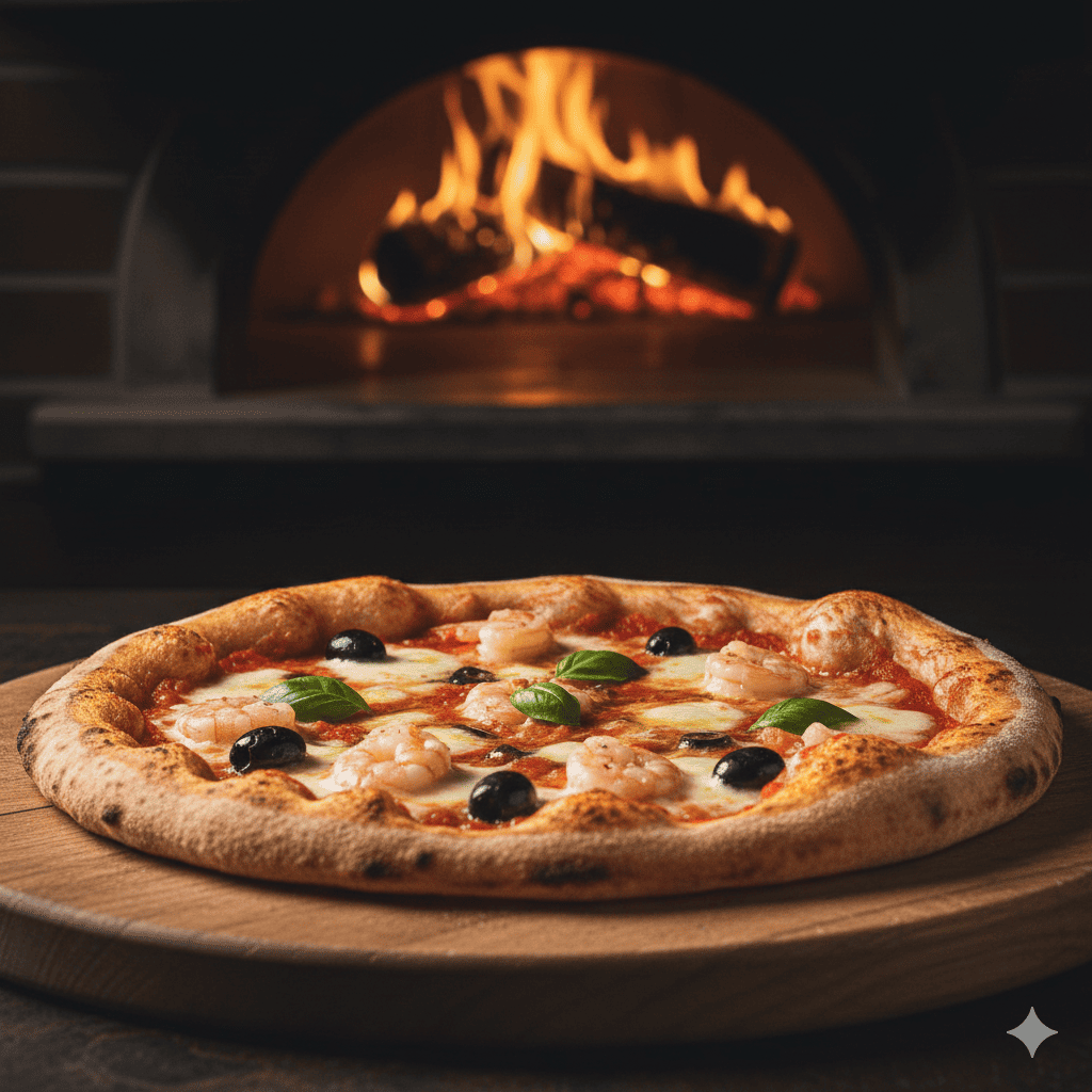 Base tomate, merguez, poivrons, oignons, olives, œuf, mozzarella
