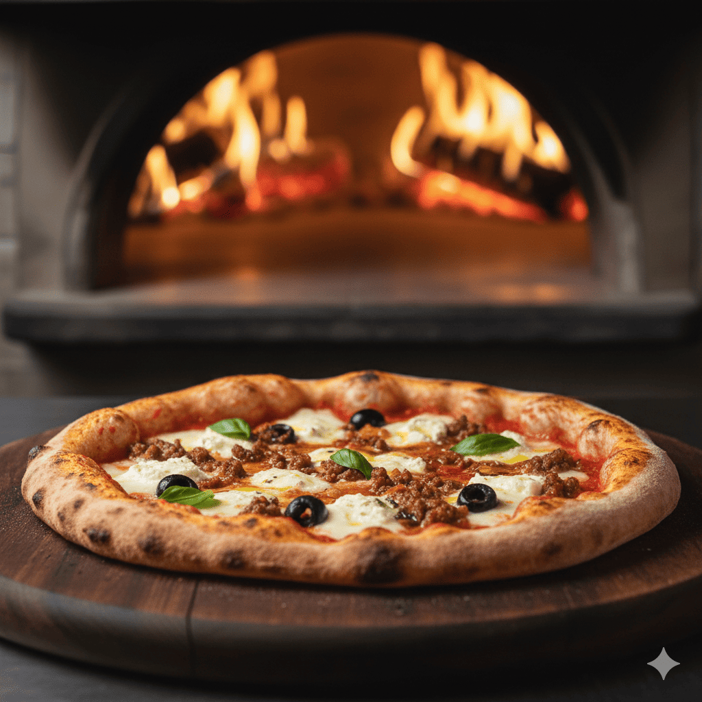 Base tomate, viande hachée, boursin, olives, mozzarella