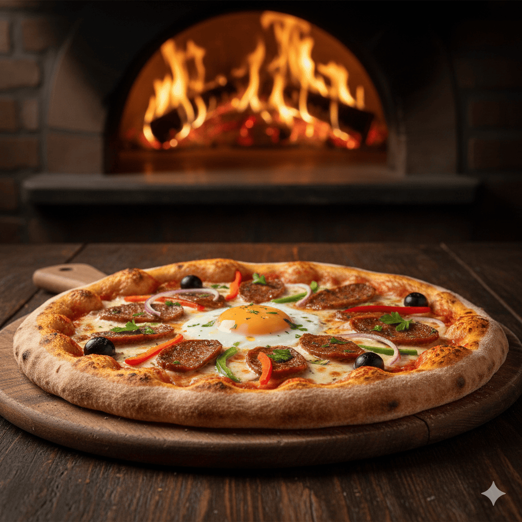 Base tomate, merguez, poivrons, oignons, olives, œuf, mozzarella