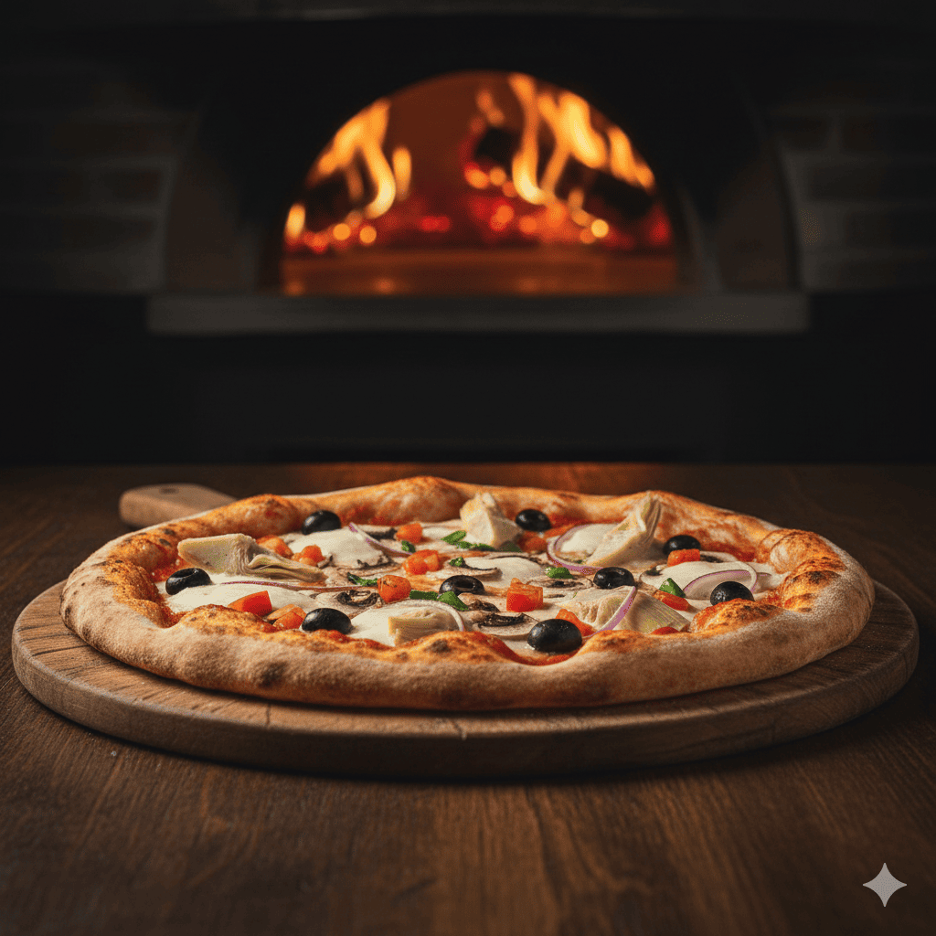 Base tomate, artichauts, champignons, oignons, olives, tomates, mozzarella