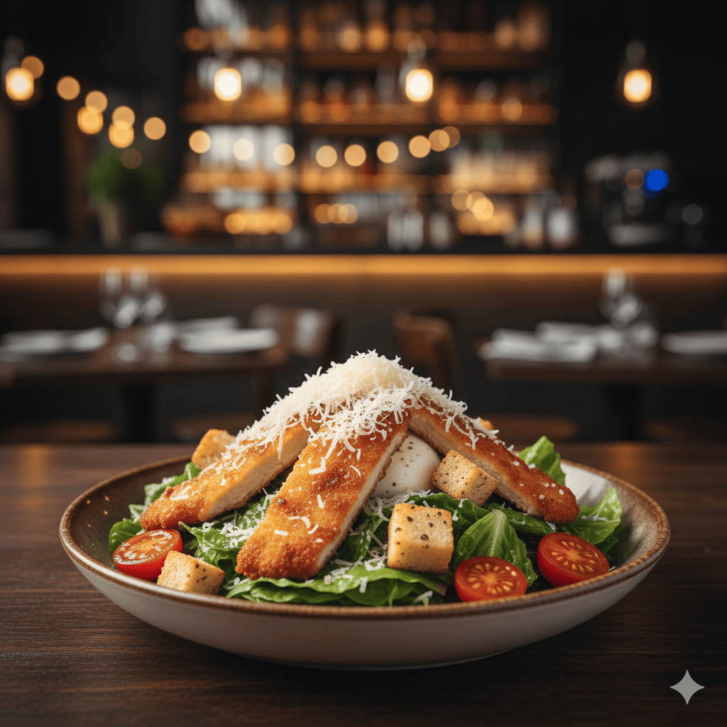 Salade, escalope, croûtons, tomates cerises, parmesan