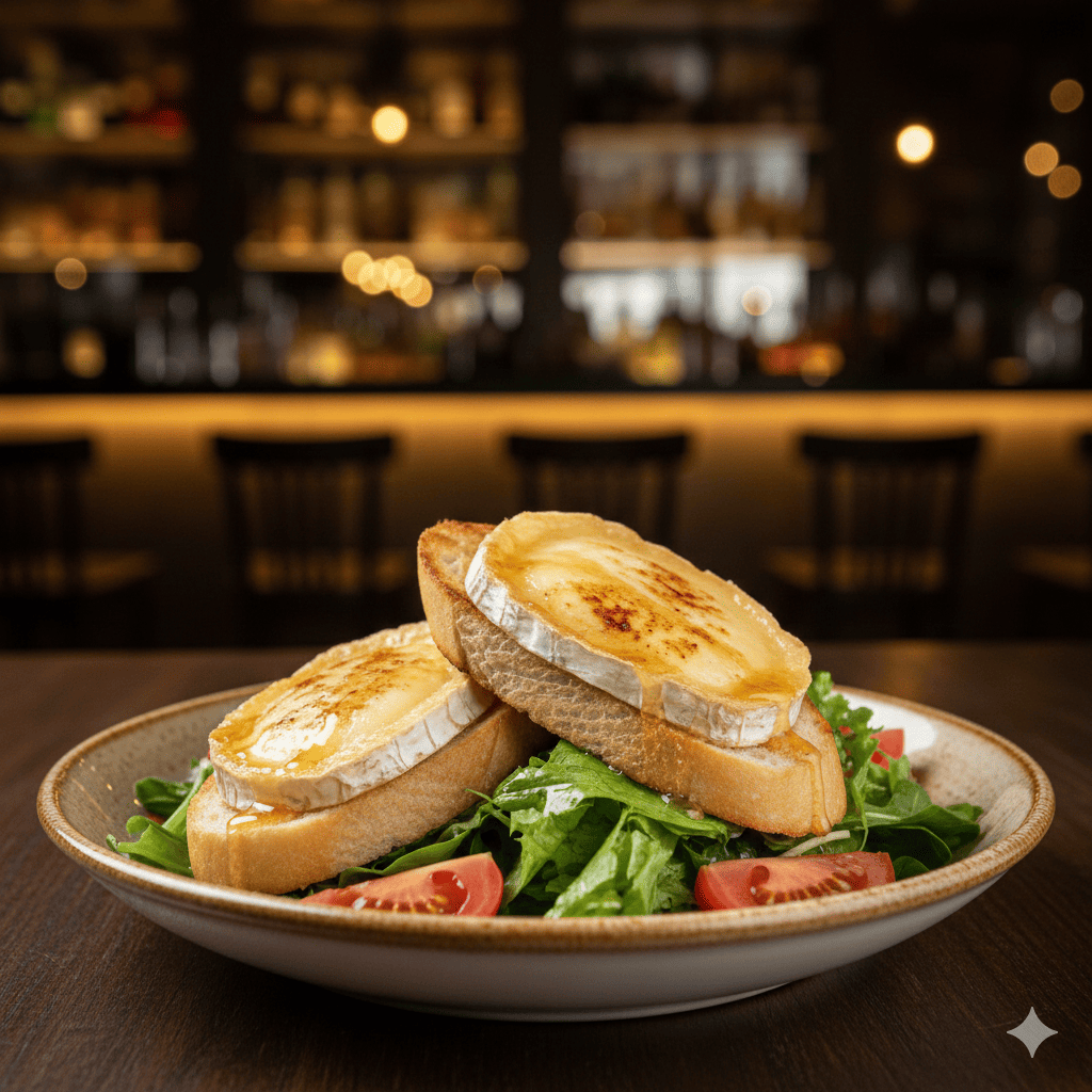 Salade, tomates, toasts grillés au fromage de chèvre, miel