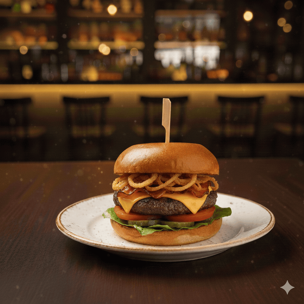 Cornichons, tomates, salade, 2 steaks, cheddar, bacon, oignons frits