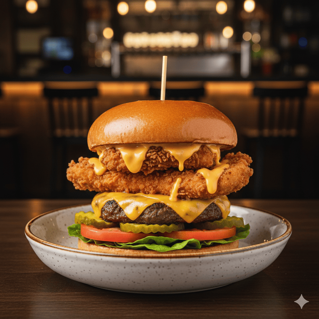Cornichons, tomates, salade, 2 steaks, cheddar, bacon, oignons frits