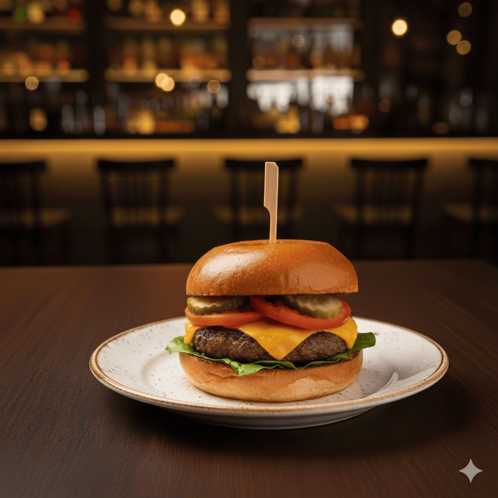 Cornichons, tomates, salade, 2 steaks, cheddar, bacon, oignons frits
